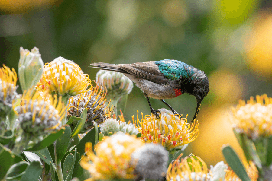 Once you have had your fill of the views – looming mountain ranges, the Indian Ocean, the Atlantic Ocean – your attention will be drawn to the extraordinary plants – and their supporting animal cast – that lie at your feet. Familiar botanical names – proteas, orchids, heathers, reeds – form an ecological partnership with bejewelled sunbirds and crocodile-like crag lizards to create the fynbos biome, and although animal life is limited on the mountain, it is unique and often colourful.